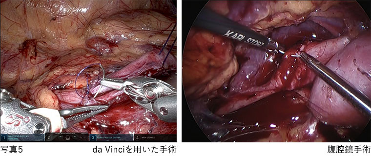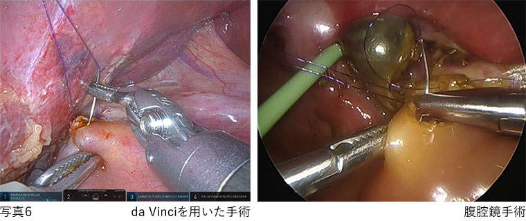 da Vinciを用いた手術は従来の腹腔鏡手術とどのように違うのでしょうか。当科で行っている腎盂尿管移行部通過障害(写真5)と先天性胆道拡張症(写真6)に対する手術の同じ操作の画像を比較しました。